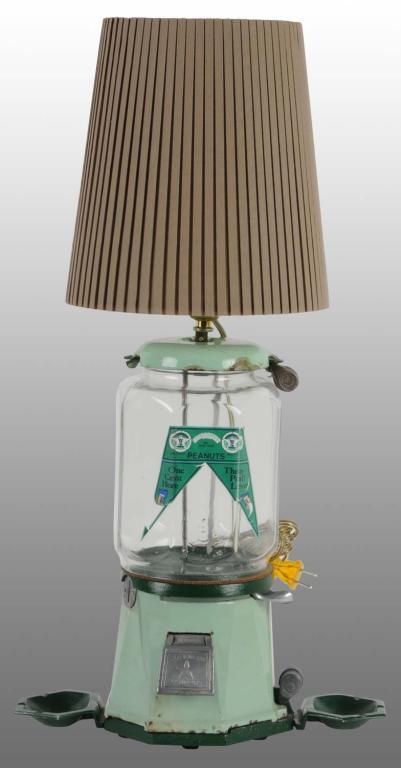 Description Working. Includes cast iron ashtrays with lid. Decal appears to be a reproduction. Heavy chipping throughout and green areas have been repainted. Includes two barrel locks with keys. Rare lamp lid. Condition (Restored). Size 13 - 1/2" T.