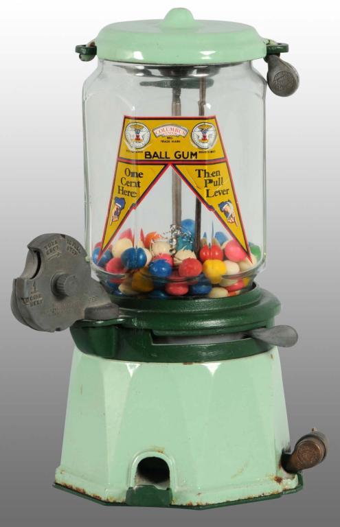 Description Includes slug-ejector. Green porcelain in good condition, decal appears to be a reproduction, and base appears to have been repainted. Keys and two barrel locks are included. Rare small hex globe. Condition (Very Good). Size 11" T.