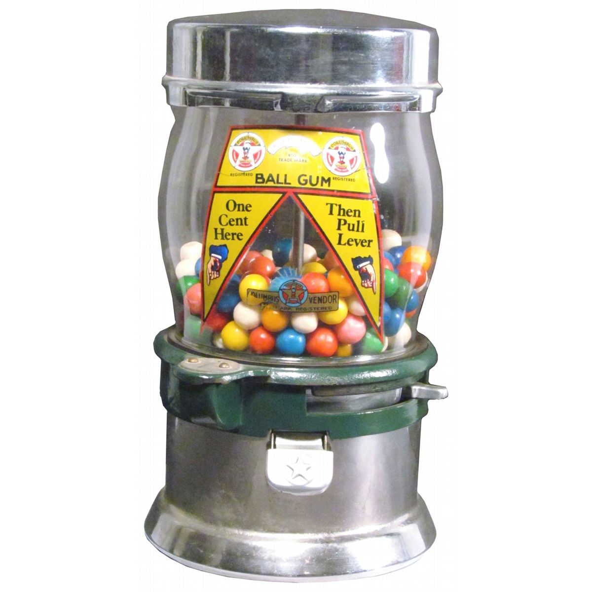 Columbus Model "V" Ball Gum Vendor, 1930. Comes with wall mounting bracket. Excellent original condition. 6 1/2 inch diameter X 11 inches tall.