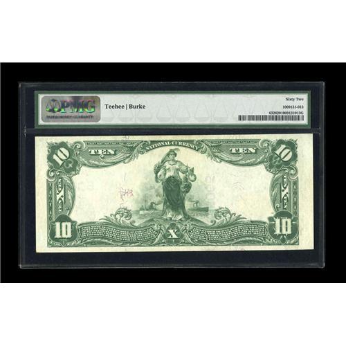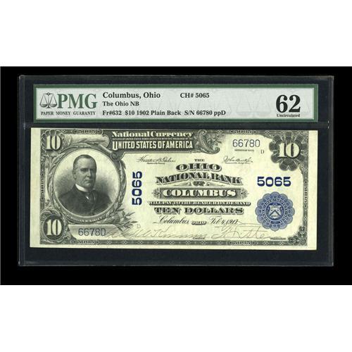<B>Columbus, OH</B></I> - $10 1902 Plain Back Fr. 632 <B>The Ohio NB </B></I> Ch. # 5065<BR>A bright state capital note which is certified as <B>PMG Uncirculated 62,</B></I> no doubt kept from a higher grade by the tight top margin.