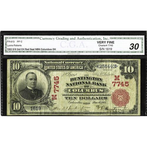 <B>Columbus, OH</B></I> - $10 1902 Red Seal Fr. 613 <B>The Huntington NB</B></I> Ch. # (M)7745<BR>This is the only $10 Red Seal reported to date from here. This institution represents a classic American success story, starting as a small family owned bank in 1905 and eventually becoming one of the largest banks in the country by the late 1990's. Bright <B>CGA Very Fine 30,</B></I> with pen signatures of Theo S. Huntington and F.R. Huntington, Vice President.<BR><I>From The Troy Wiseman Collection</B></I>
