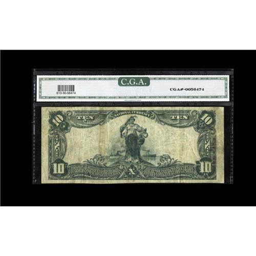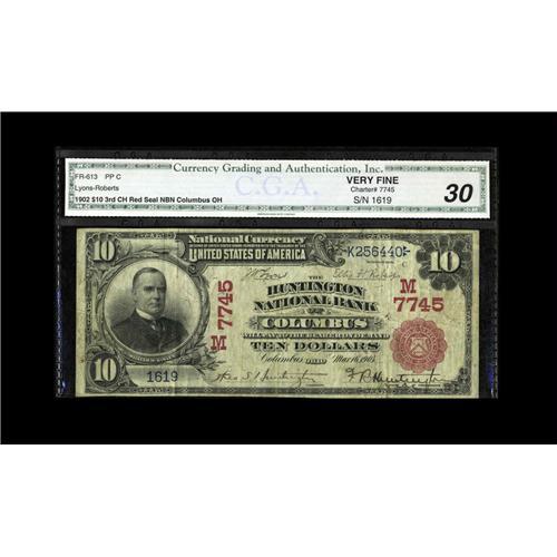 <B>Columbus, OH</B></I> - $10 1902 Red Seal Fr. 613 <B>The Huntington NB</B></I> Ch. # (M)7745<BR>This is the only $10 Red Seal reported to date from here. This institution represents a classic American success story, starting as a small family owned bank in 1905 and eventually becoming one of the largest banks in the country by the late 1990's. Graded <B>Very Fine 30,</B></I> by CGA with pen signatures of Theo S. Huntington and F.R. Huntington, Vice President.