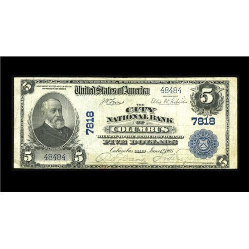 <B>Columbus, OH</B></I> - $5 1902 Plain Back Fr. 598 <B>The City NB</B></I> Ch. # 7818<BR>A very presentable middle grade $5 Plain Back that is only the third such note traced from this state capital issuer. <B>Fine-Very Fine</B></I> and likely to sell for...