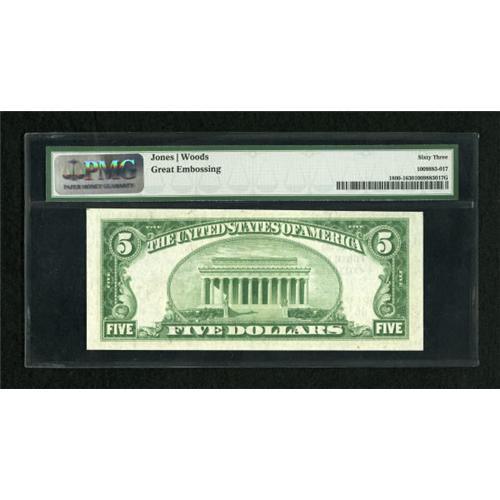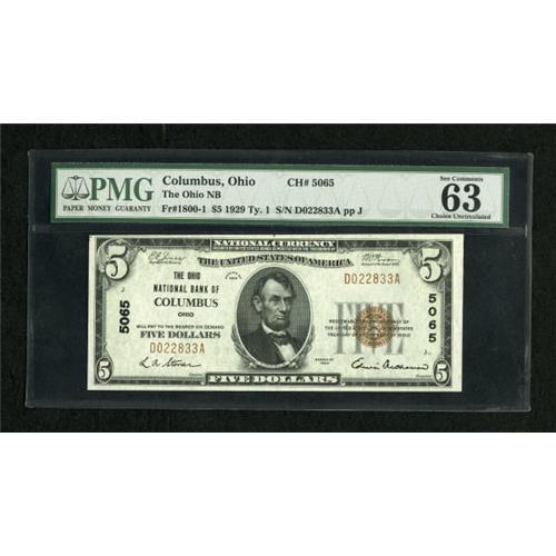 <B>Columbus, OH</B></I> - $5 1929 Ty. 1 <B>The Ohio NB</B></I> Ch. # 5065<BR> Great embossing is noted by PMG on the holder of this bright Ohio issue. <B>PMG Choice Uncirculated 63</B></I>.<BR><BR><b>Shipping:</b> Coins & Currency (<a target="_blank" href="http://www.heritageauctions.com/common/shipping.php">view shipping information</a>)