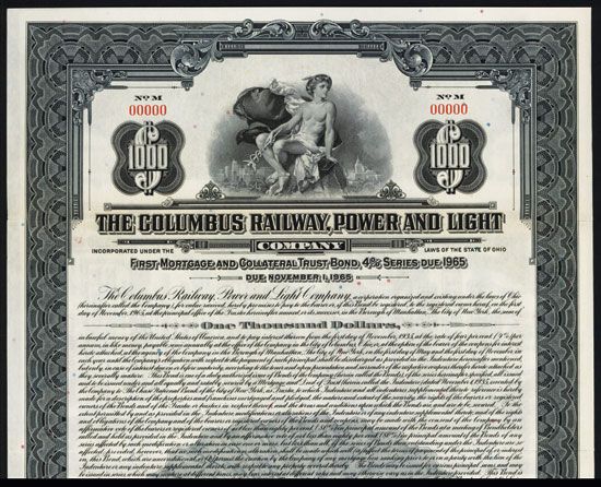 Ohio, 1935, $1000, 4% 1st Mortgage Collateral Trust Specimen Bond, Black on purple border and underprint, God of Mercury sitting top center with city in foreground, VF-XF condition, ABNC.