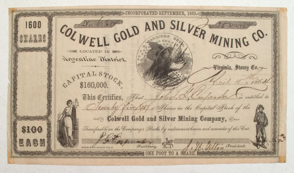 Rare stock with connections to the discovery of gold in California! This is stock #68 for 25 shares to John G Carpenter. It is signed by Carpenter as secretary and J. H. Tilton as President. Three vignettes: patriotic bald eagle with shield, Miss Liberty holding the scales of justice, and a miner holding a pick axe. States mines were in the Argentine District. Only 1,600 shares were ever issued with one share equaling one foot. Carpenter was an early noted California pioneer and friend of James Marshall the discoverer of gold. It was Carpenter who talked Marshall into 'posing' for the famous photo of him now in the Smithsonian. Marshall, who had become an alcoholic, was in Sacramento and had asked Carpenter to buy him a bottle of booze. Carpenter agreed, but only on the condition that Marshall have his picture taken. With his hair askew and uncombed and with an untidy & graying growth of beard underway, Marshall stared blankly into the camera for this famous picture. City: Virginia CityCounty: StoreyState: NV