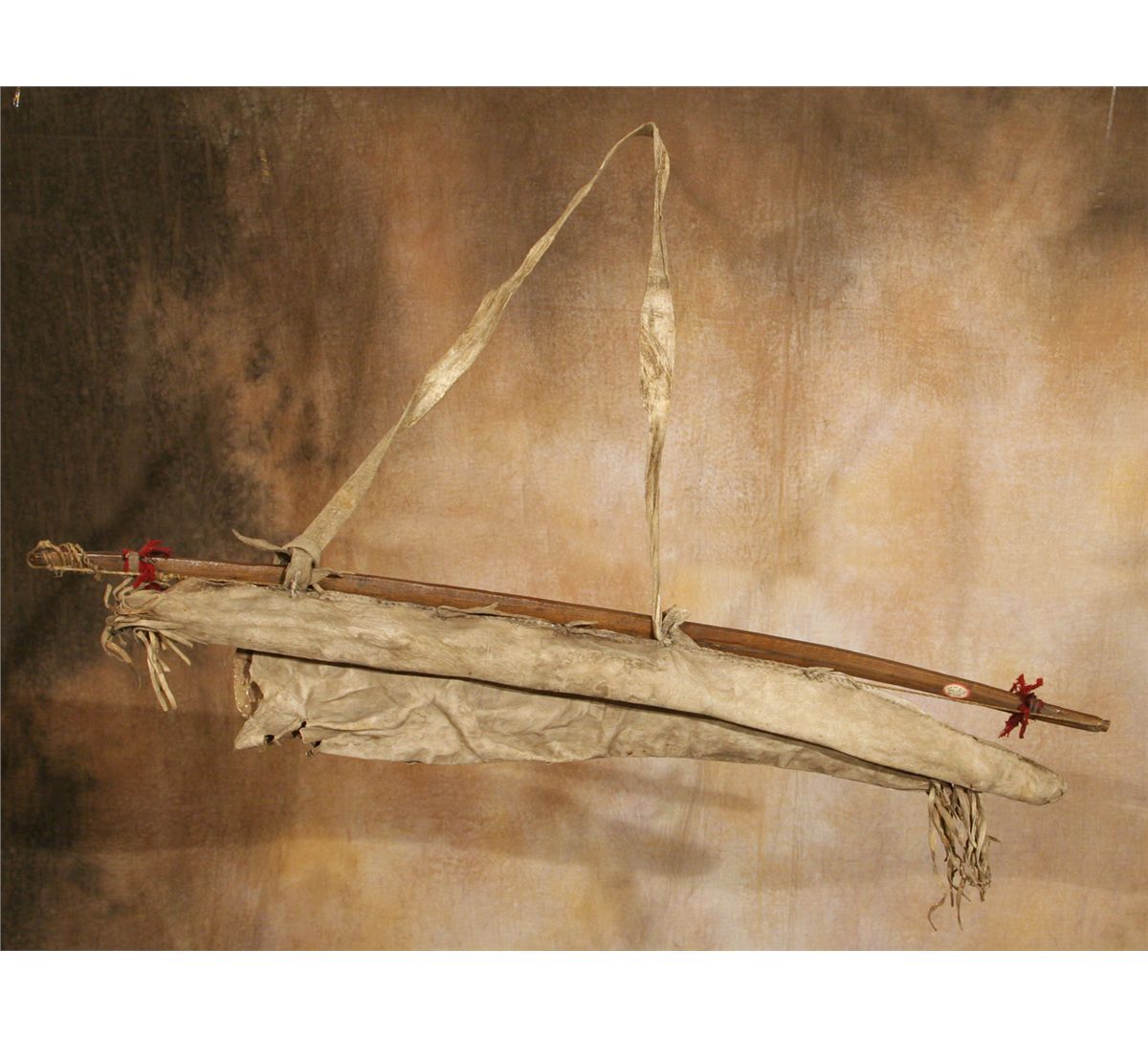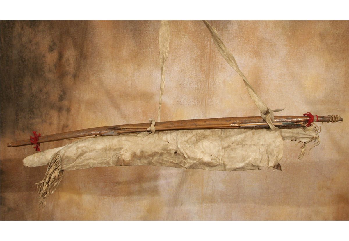 Comanche Bow and Quiver Case. 39" long. Made from hide and decorated with fringe. Includes a 44" bow with red cloth adornments and two 26" arrows with steel tips. 19th century.