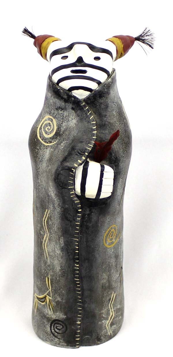 Limited Edition Comanche Tribal People Series Pottery Koshare by Judith Peele ''Morning Dove'', measures 4'' x 12'' x 4'', embellished with single feather and horse hair, Lazart Productions Collector Series, comes with informational card, limited edition of 7500, signed