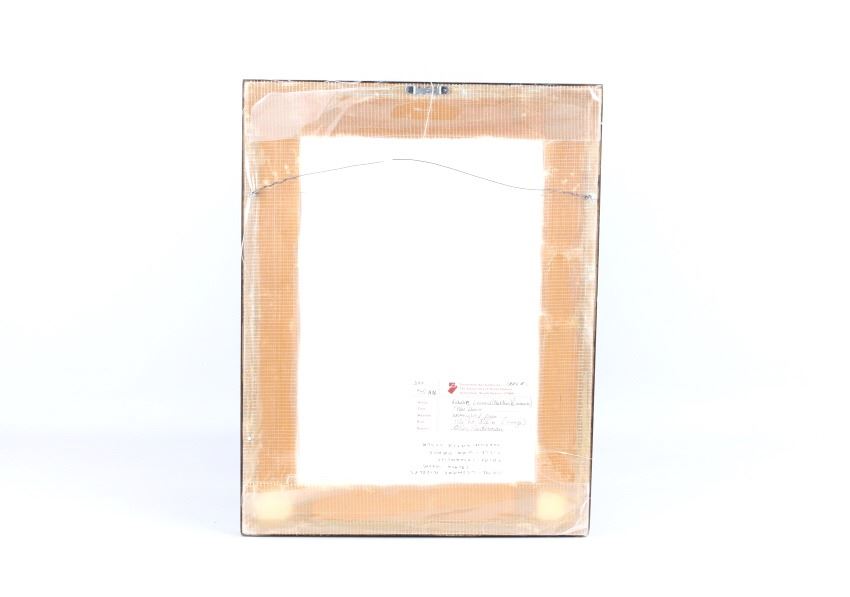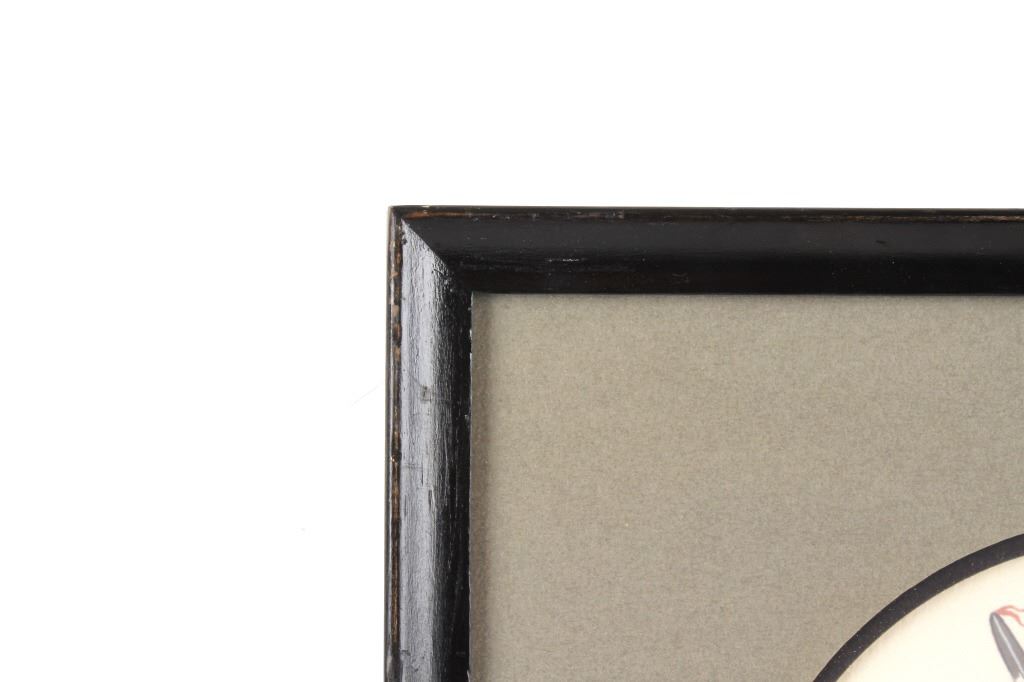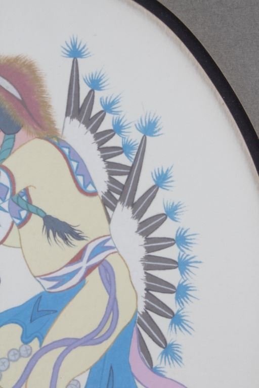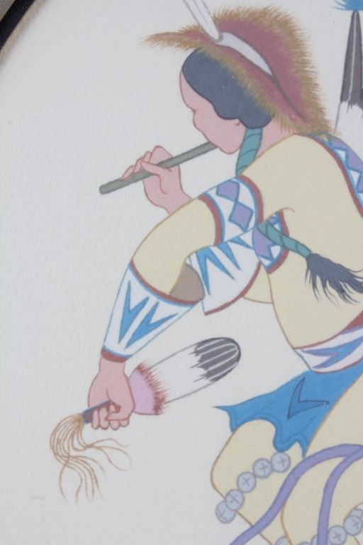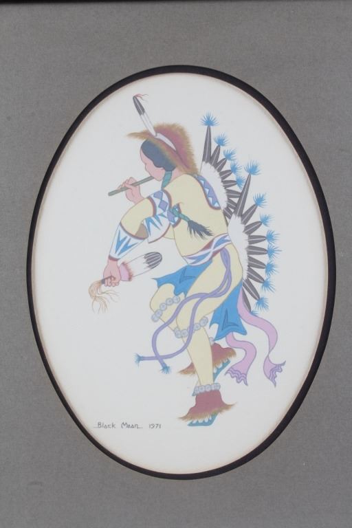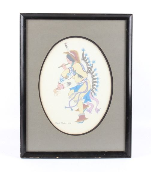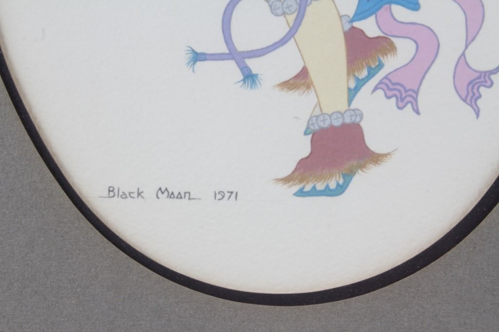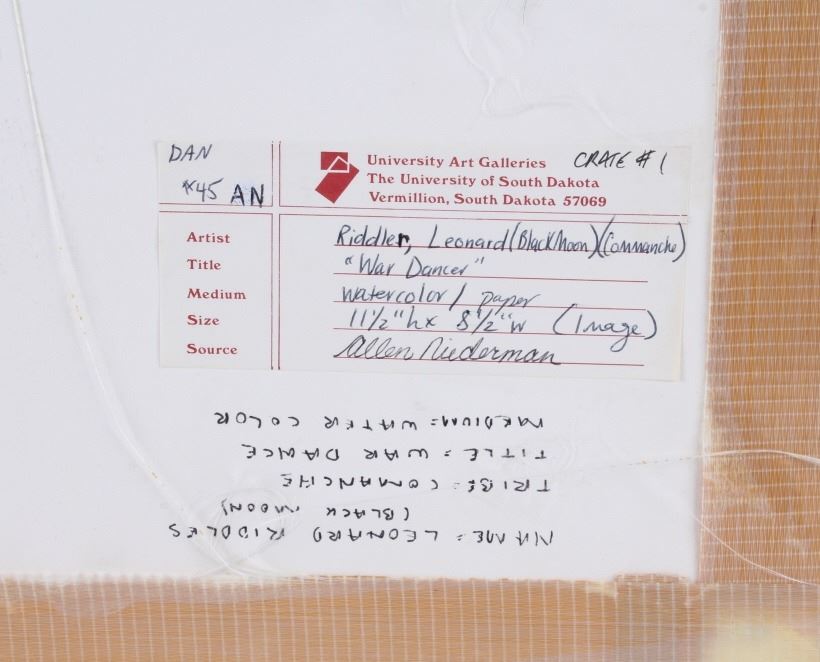For your consideration is an original water color painting titled "War Dancer" by Leonard Riddles 1918-2003. Leonard Riddles, known as Black Moon, was an internationally known artist, painting and sketching the Indian way of life. Many of his paintings hang in permanent collections around the world. This piece is of a Comanche war dancer showing wonderful colors and details consistent with the artist's style. There is an artists hand written signature "Black Moon 1971" in the lower left corner. On the reverse of the frame is a Universities Art Galleries label from the University of South Dakota detailing information about the artwork. This is also handwritten on the back of the frame. The visible art is shown in an oval shape and measures approximately 8.5x11.5" and the frame measures 13x17".
