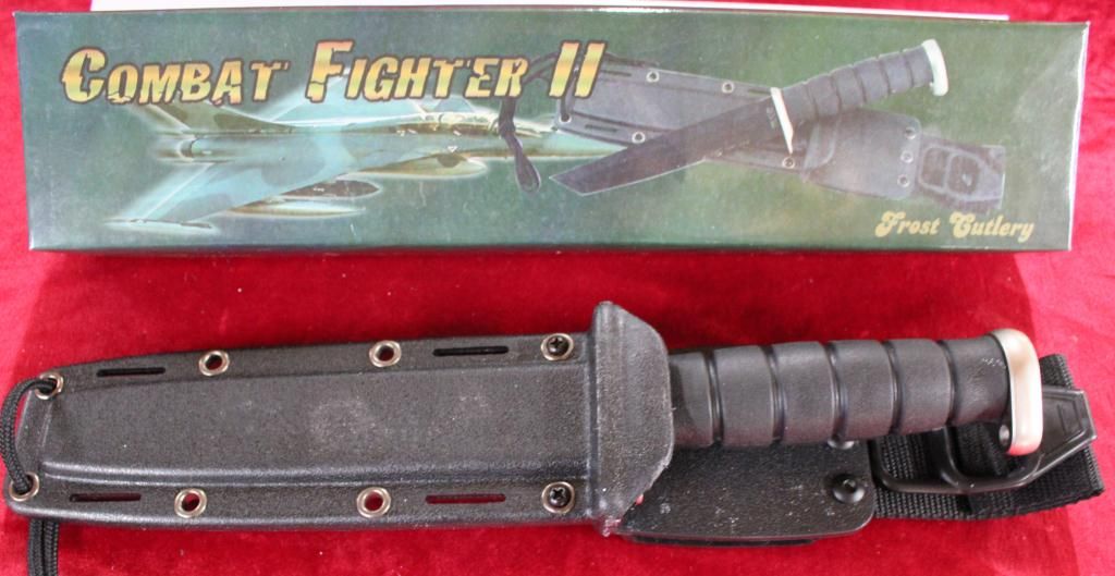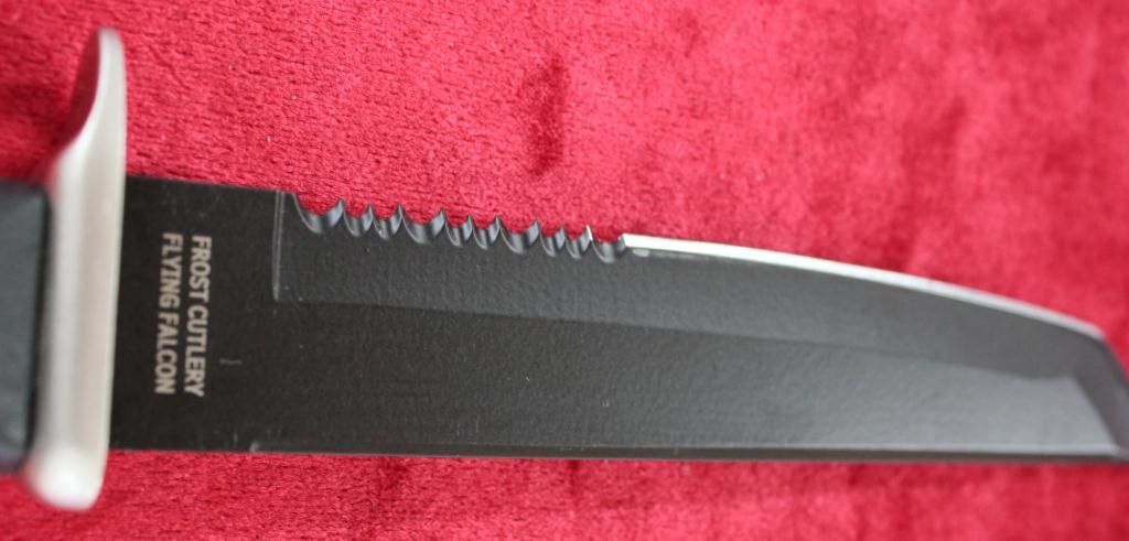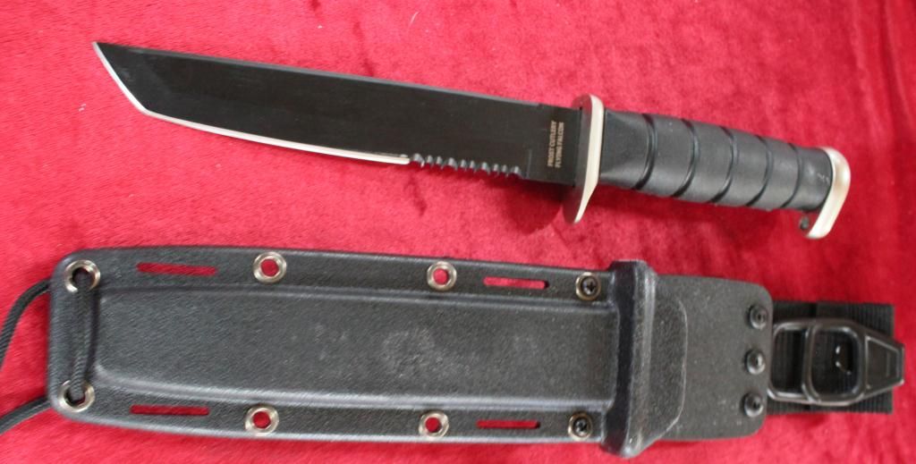 Black Stainless Steel Tanto Partially Serrated Blade. Brushed Metal Guard & Pommel. Black Composition Handle. Hard Composition Sheath With Tie Cords