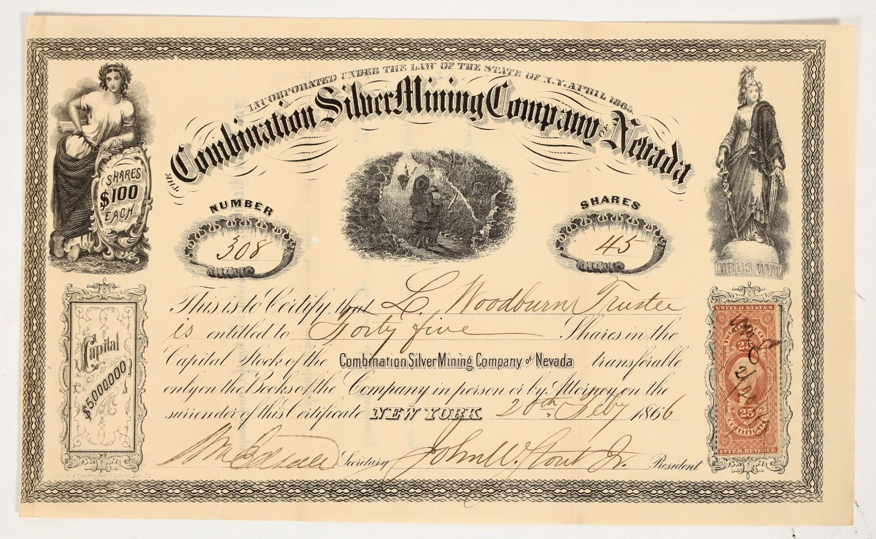 Inc. in NY, 1865. No. 308, issued for 45 shares to L. Woodburn in New York in 1866. Signed by president John Stout Jr. and secretary Edsall. Not cancelled. Two allegorical vignettes and one mining vignette. 25 cent revenue stamp on right. Folds, toning. According to a May 13, 1868 Daily Territorial Enterprise article, this company operated at Belmont and was "in a flourishing condition and producing daily about $2,500 in bullion." 6.25 x 10.5"