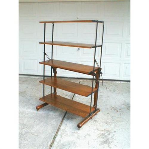 This combination table / bakers rack is so unique. It was probably made by The Combination Table Company in Bryan Ohio, but this table does not have any label to verify this. This type of combination was very useful for dispaly purposes in Bakeries, General or Country stores. As a bakers rack, the unit stands 57 inches tall,36.5 wide and 23.5 deep. The unit can be adjusted to be a graduated shelf or to fully lay down into a table. As a table is measures 33 inches tall, 61 long adn 36.5 deep. It is made of oak with iron reinforcement brackets and is highly different. This unit has been refinished and is ready for your home. What a unique, one of a kind, decorating item.