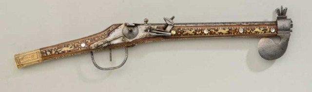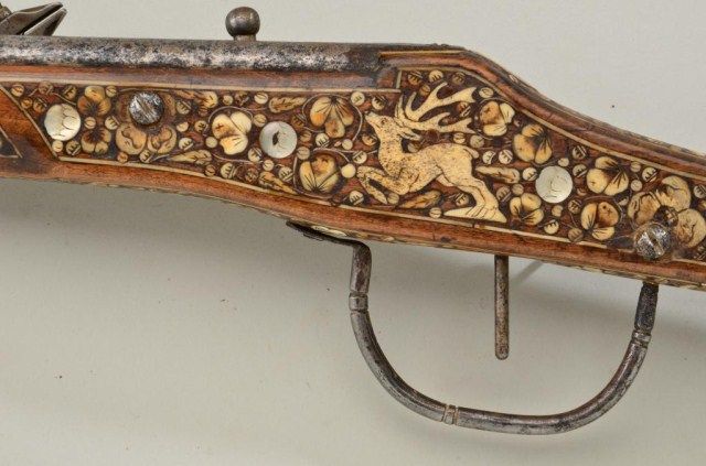 Combination Wheelock battle axe in Germanic style with fully bone inlaid stock with pearl accents. The weapon measures 29-1/2” overall with a 17-1/4” barrel of approx 52 cal smooth bore. The axe head measuresapprox 6-1/2” from edge to top and approx 3-1/2” across the blade. The metal surfaces show some light to slightly heavy scattered erosion pinprick pitting. The trigger guard, blade and small parts are constructed offorged metal in 17th century style and the inlays are also of the correct style but are 19th century in our opinion, probably made by Spitzer or other Victorian era workman. The stock is in good condition showing a coupleof small repairs and most of its original inlays. A very interesting and decorative piece, the interior of the lock contains no chain or spring and this indicates 19th century also. A very decorative artifactthat is antique and about 150 years old. From an old New York collector’s estate. Est.;$2,500-$5,000.