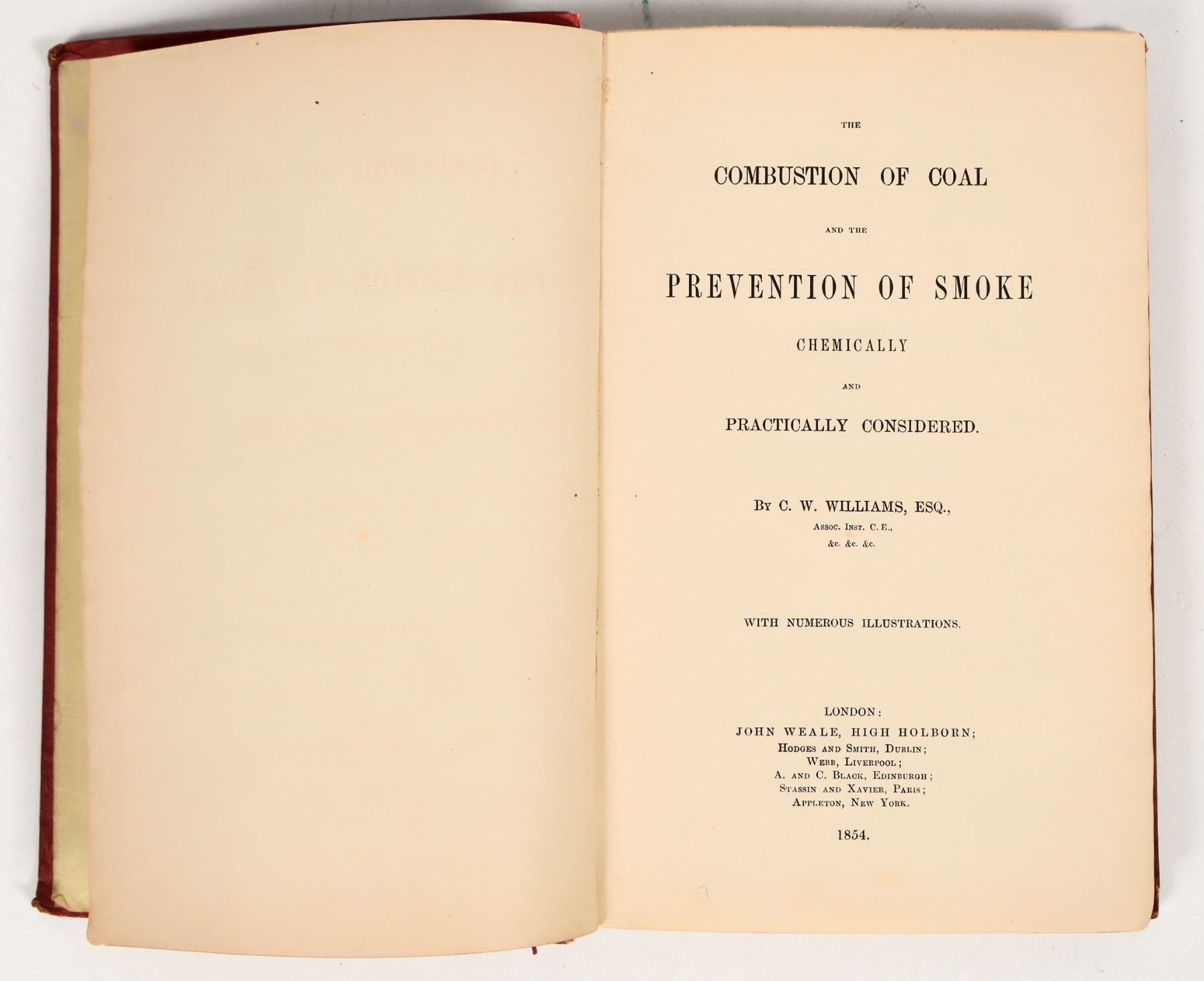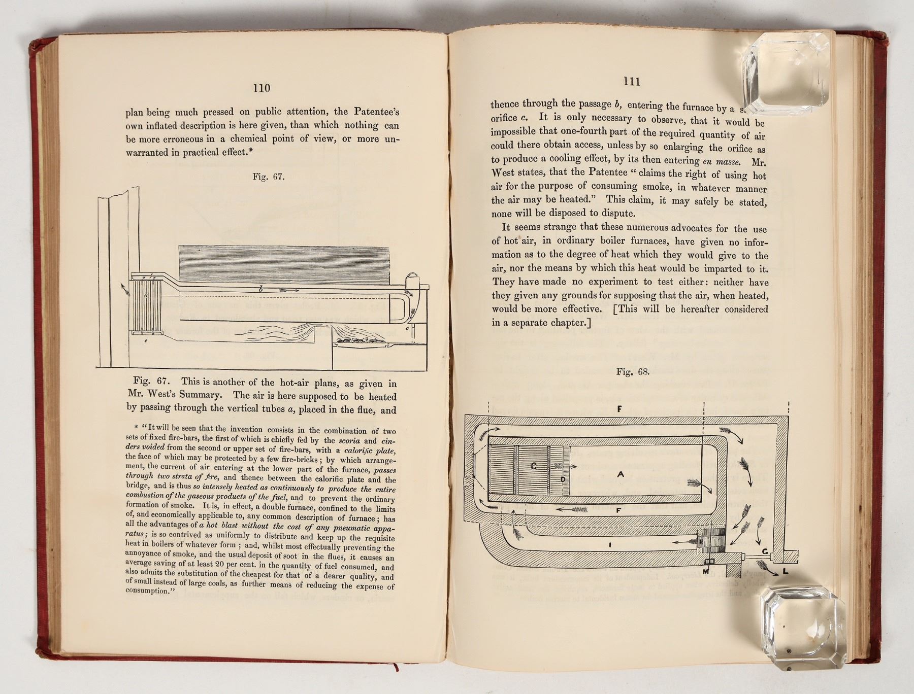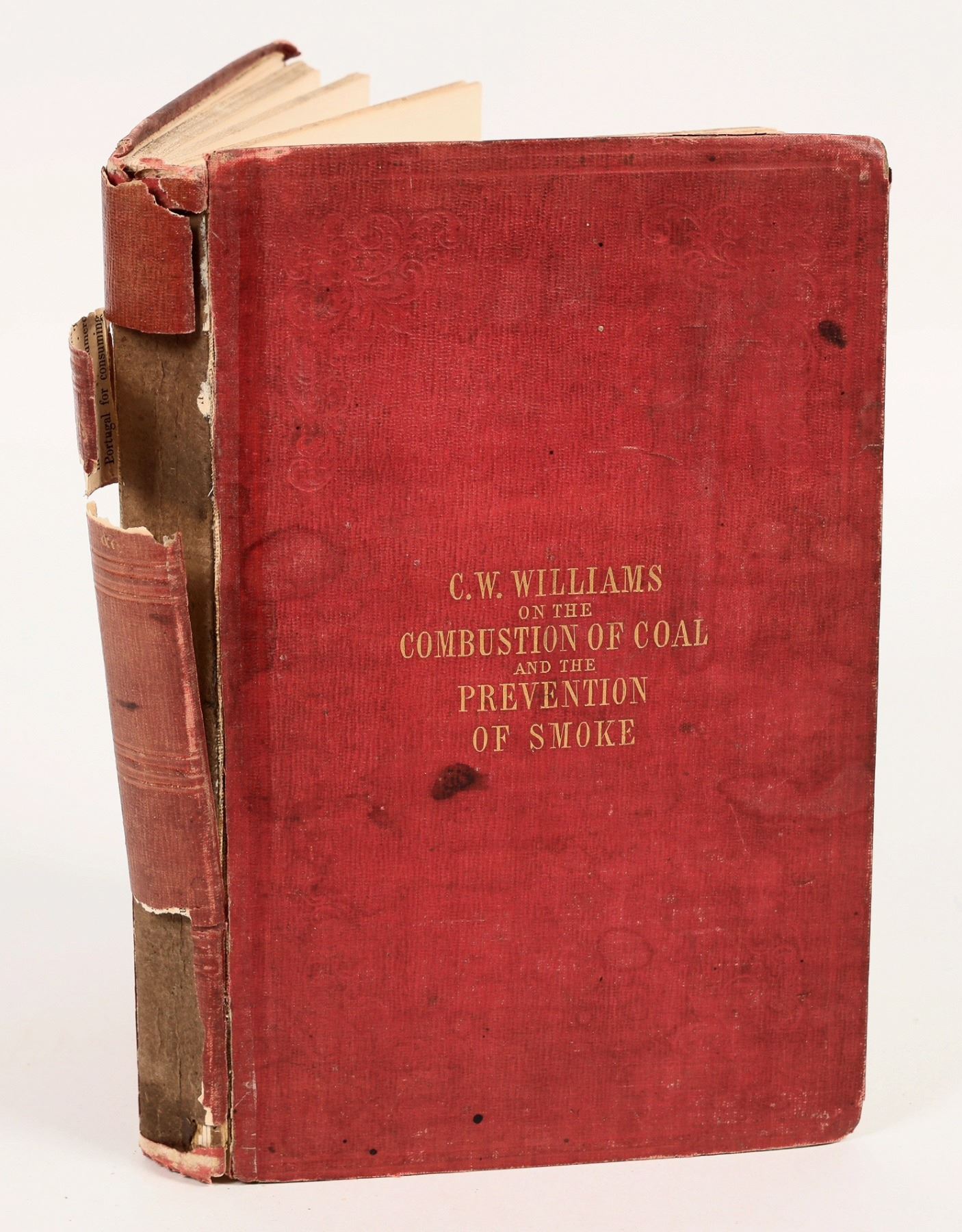 Extremely rare hardcover manuscript, "The Combustion of Coal and the Prevention of Smoke Chemically and Practically Considered,' with numerous illustration. Published in London by John Weale, High Holborn, 1854. 244 pages, plus 40 pages of appendices. 141 illustrations. First published in 1840. Overall good to almost excellent condition, some wear on the covers and pages, minor soiling. Measures 9"x6". Antique excellence!