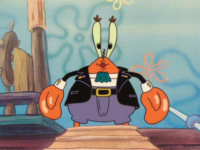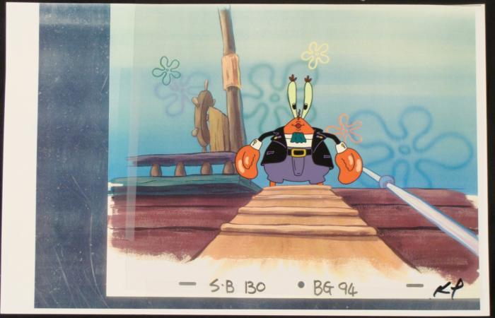 This animation cel and reproduction background are from the Nickelodeon TV show SpongeBob Squarepants. The story takes place under the deep blue sea in Bikini Bottom, where SpongeBob resides. SpongeBob, who is a yellow, porous sponge, is your typical happy-go-lucky character, as he is always cheerful and enjoys making people laugh. Patrick Star, SpongeBob's neighbor who is a starfish, is your average children's show idiot, as he boasts knowing nothing and is often getting himself into ridiculous situations. Between the homes of these two lies the home of the miserable Squidward, a squid, who is known for being grouchy and playing tricks on SpongeBob and Patrick. Both SpongeBob and Squidward work at the Krusty Krab, a fast food business run by the greedy money-loving Mr. Krabs, a crab, the arch rival of the evil, possibly misunderstood, Plankton. Another neighbor, Sandy Cheeks, an athletic squirrel who normally wears an astronaut's space suit, was introduced in "Tea at the Treedome." She spends most of her time inventing and experimenting. "Come aboard my ship!"Original Printed Background and Animated Cel Overall Size of Background: 11" x 17" Overall Size of the Cel: 10 1/2" x 12 1/2" Very good condition; it has been storedThis is an original hand-painted cel set-up used in the production of an episode of "SpongeBob SquarePants." Each one-of-a-kind set-up represents a slight change in position of the characters. When individually photographed and projected in rapid succession, the images appear to move.