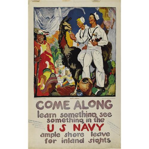 <B>Come Along, Learn Something, See Something in the Navy!</B></I> 28" x 42" Artist: James H Daughtery. Poster depicts two sailors enjoying themselves in South America. They are even feeding bananas to a llama. A bright colorful poster for any Navy fan out there. <BR><BR>Condition: Fine- stamps from the original recruiting office which displayed this poster are visible; lower edge has several tears which have been mended by the superb linen backing; the white edges are soiled slightly; two linen hangers are attached at the top for hanging.