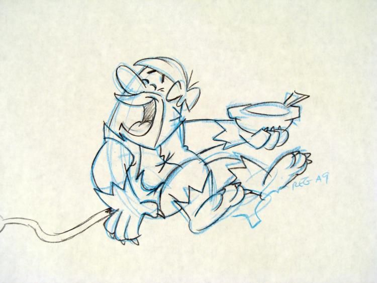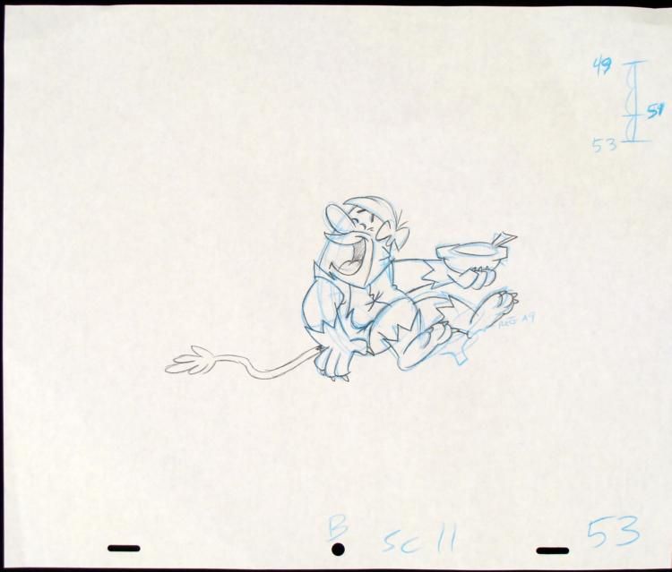 The show is set in the Stone Age town of Bedrock. (In some of the earlier episodes, it was also referred to as "Rockville"). The Flintstones was about a working-class Stone Age man's life with his family and his next-door neighbor and best friend. The show's * continuing popularity rested heavily on its juxtaposition of modern everyday concerns in the Stone Age setting. In this fantasy version of the past, dinosaurs, saber-toothed tigers, woolly mammoths, and other long-extinct animals co-exist with cavemen. Like * their mid-20th century peers, these cavemen listen to records, live in split-level homes, and eat out at restaurants, yet their technology is made entirely from pre-industrial materials and largely powered through the use of various animals. For example, the * cars are made out of stone, wood, and animal skins, and powered by the passengers' feet. * * * That was hilarious!!! * * * * * Original "rough" animation drawing, in non-photo blue and black pencil with the notations in non-photo blue * * Overall size is a 12-field drawing that is 10 1/2" × 12 1/2" * Excellent condition * Traditional animation is a multi-step process which includes various types of art techniques. Drawings are a key part of the process, in which the animator creates the design and movement of the characters. Drawings are then transferred onto acetate cels * (by hand-inking and/or photo copying) to create a production cel, which is then hand painted on the back side, using paint colors chosen and approved by the creator of the series. * * * The drawing is ready to be matted and framed. The animator's notations are shown at the top and bottom of the drawing. * *