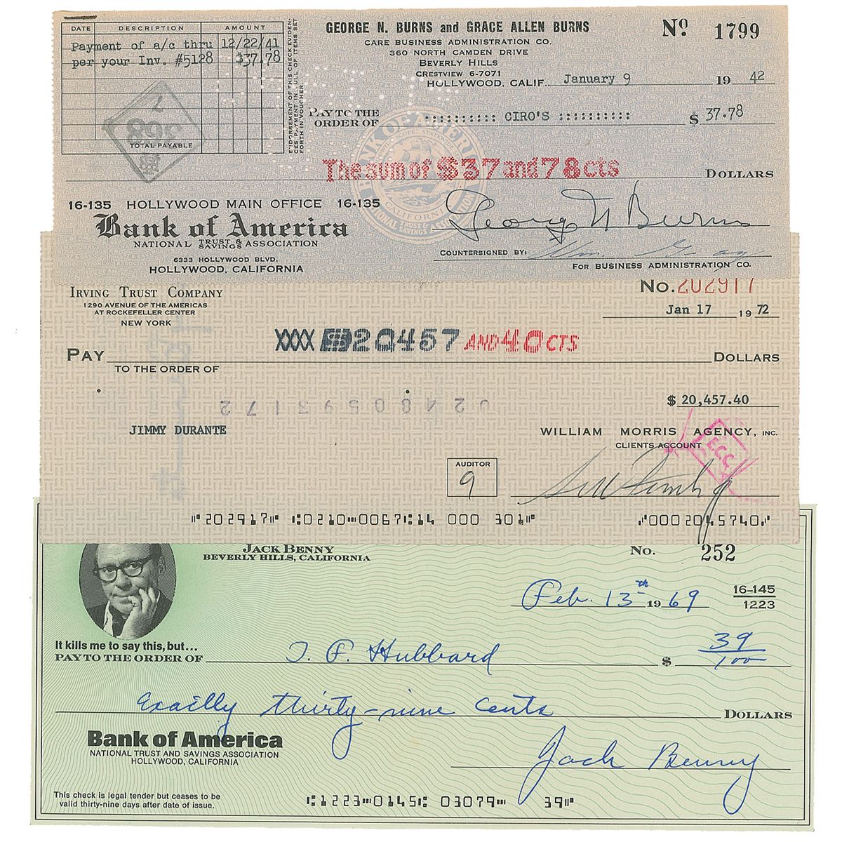 Three checks: personal check filled out and signed by Jack Benny, payable to J. F. Hubbard for “exactly thirty-nine cents,” February 13, 1969, including its original transmittal envelope bearing a pre-printed note; personal check filled out in type and signed by George Burns, payable to Ciro’s for $37.78, January 9, 1942; and a William Morris Agency business check payable to Jimmy Durante for $20,457.40, January 17, 1972, endorsed on the reverse by Durante. In overall fine condition. Accompanied by another check bearing a pre-printed Durante signature.