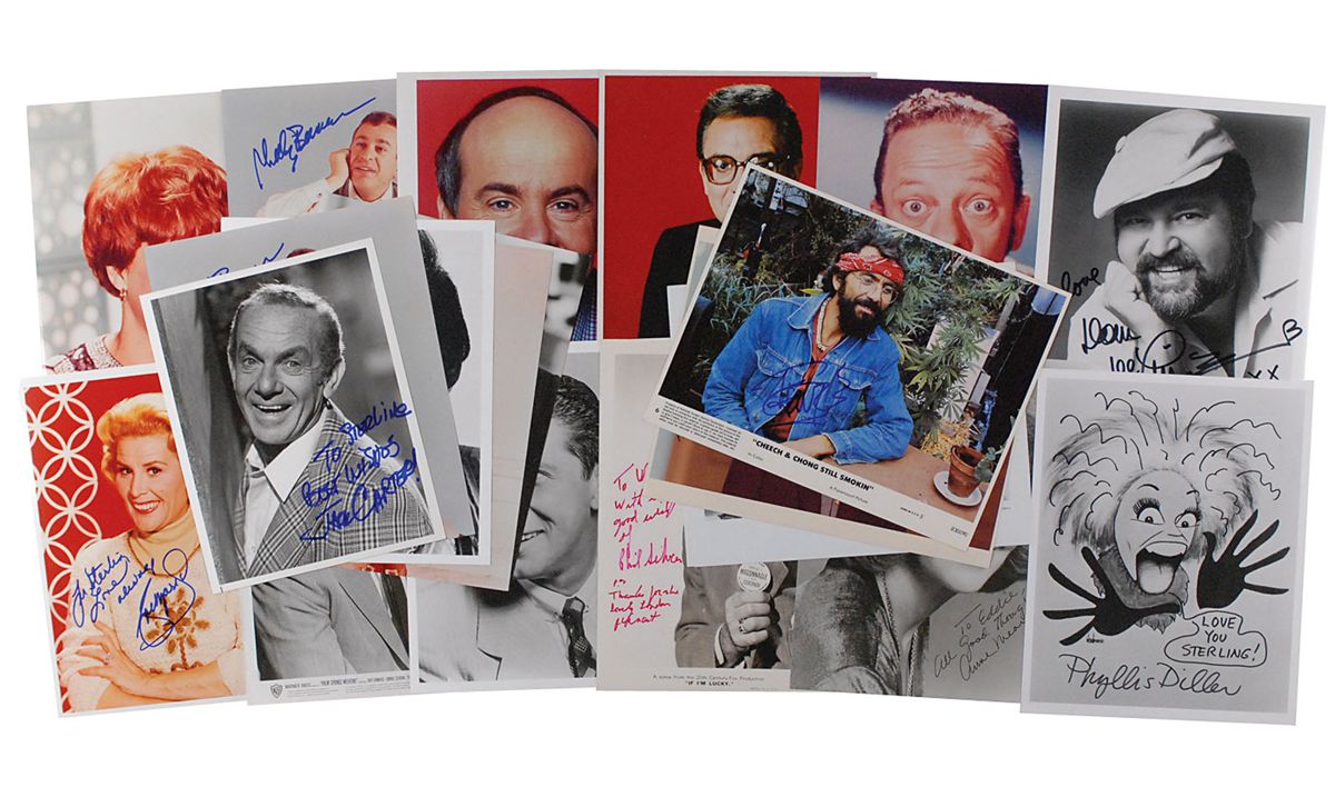 Collection of 20 photos, ten in color, nearly all 8 x 10 or 10 x 8, each signed in ink by the comedian pictured, including: Carol Burnett, Tommy Chong, Shelley Berman (2), Tim Conway, Steve Allen, Don Knotts, Dick Van Dyke, Rose Marie (inscribed), Carol Channing, Anne Meara (inscribed), Phil Silvers (inscribed), Dom DeLuise, Jack Carter (inscribed), James Coco (inscribed), Jan Murray (inscribed), Jerry Van Dyke (inscribed), Sid Caesar, ‘Weird Al’ Yankovic (inscribed), and Phyllis Diller (inscribed). In overall fine condition.