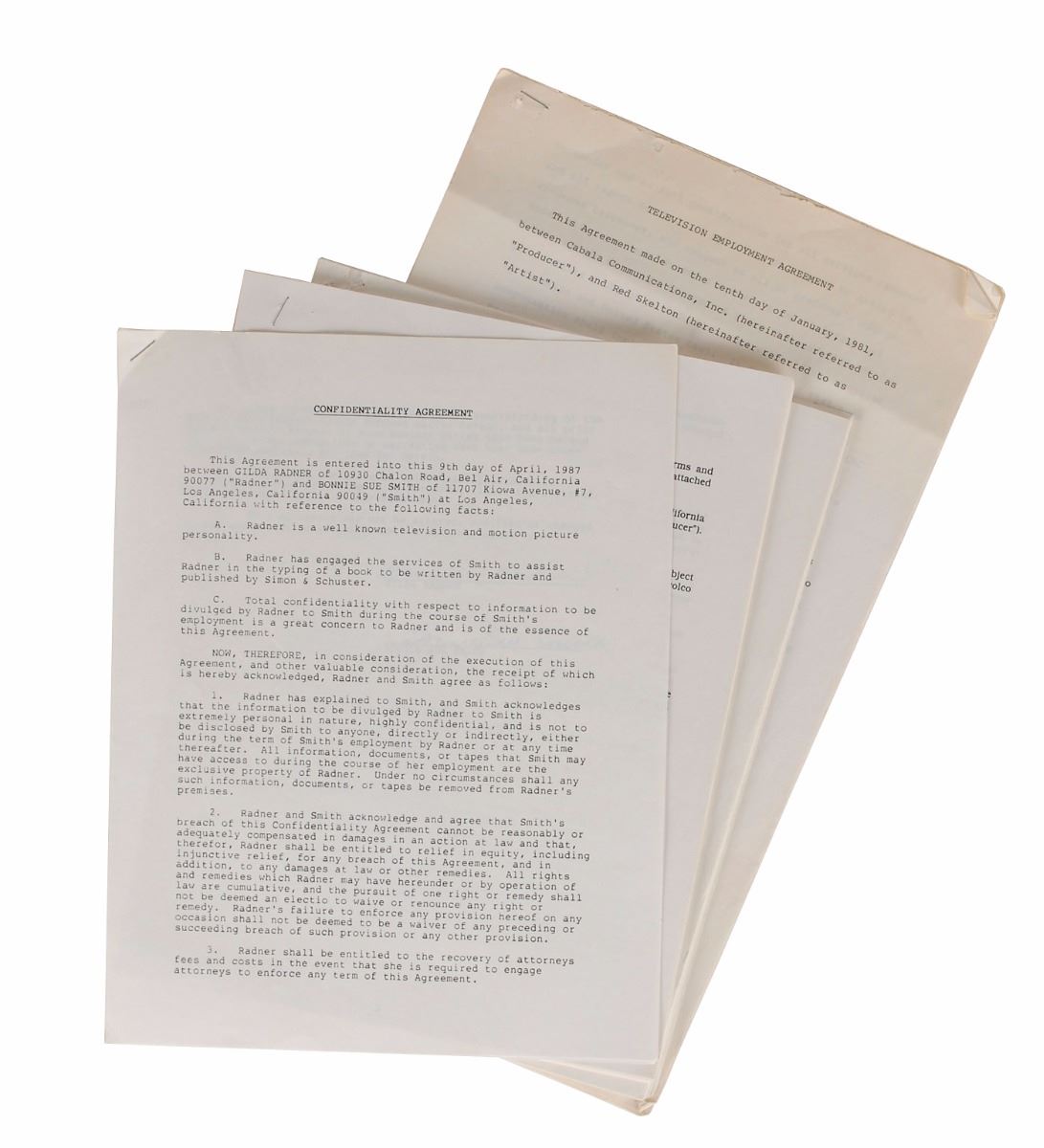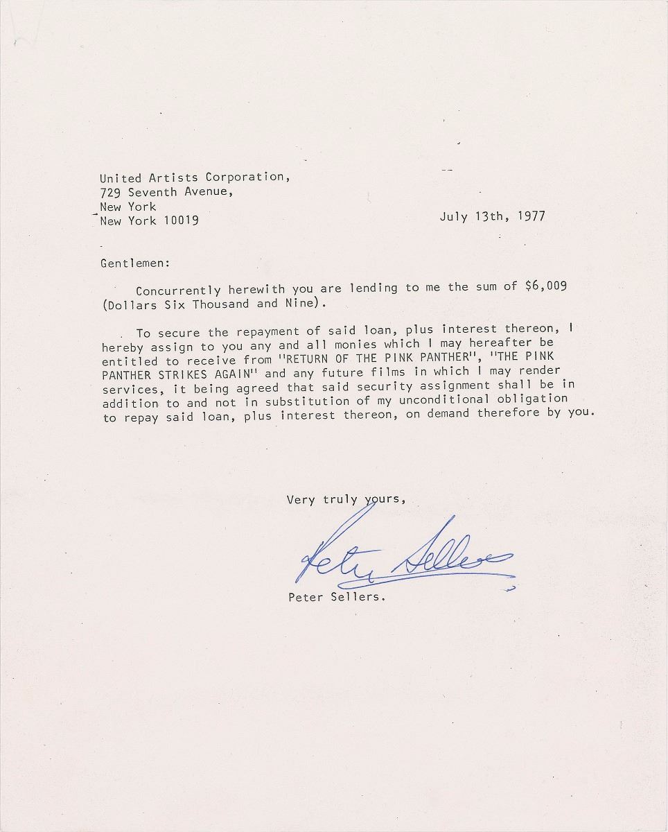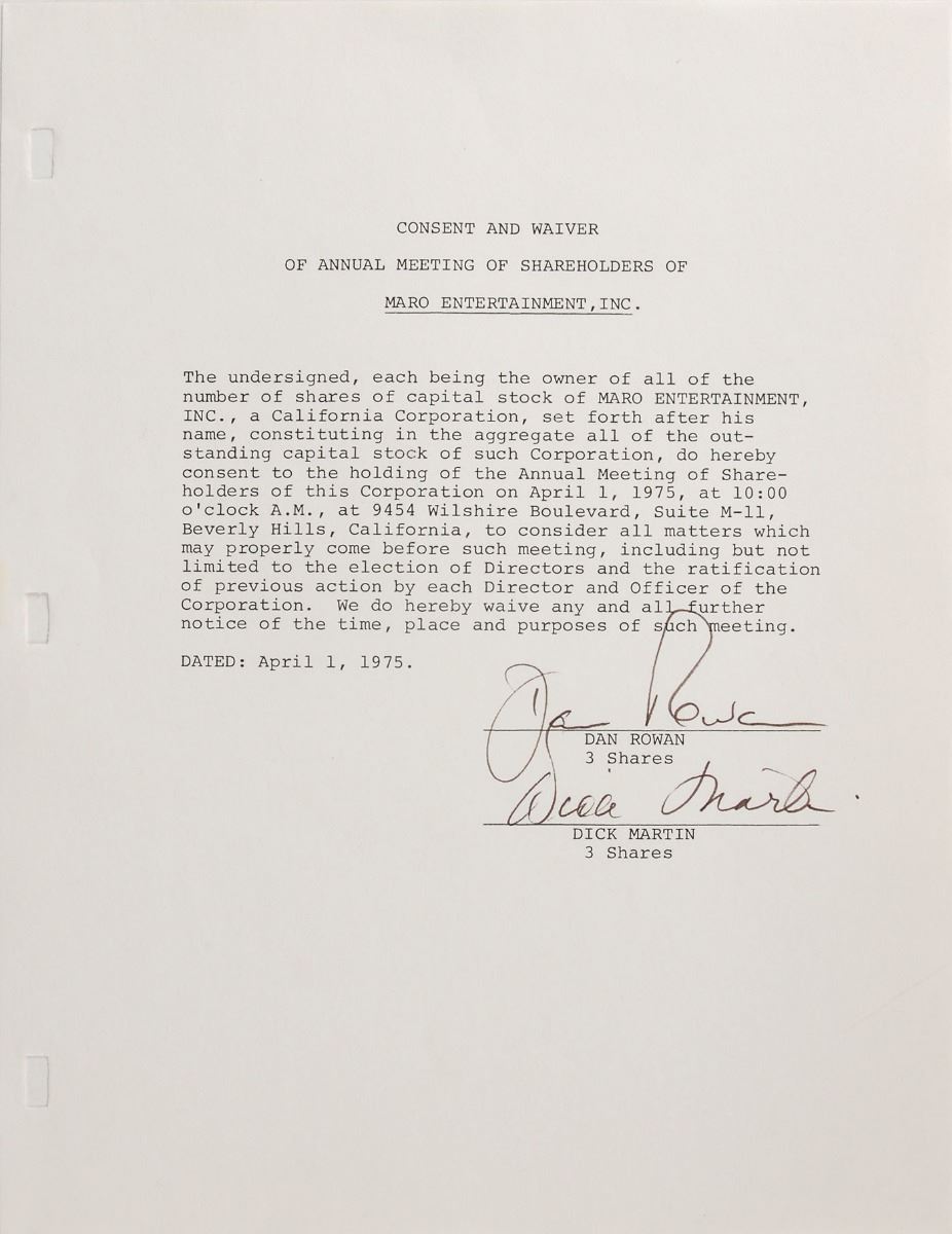 Collection of six documents signed by comedians, including: Dan Rowan and Dick Martin, Peter Sellers, Red Skelton, Steve Martin, Gilda Radner, and Rick Moranis. Also includes a letter from the personal secretary of Groucho Marx regarding “Animal Crackers.” In overall very good to fine condition.