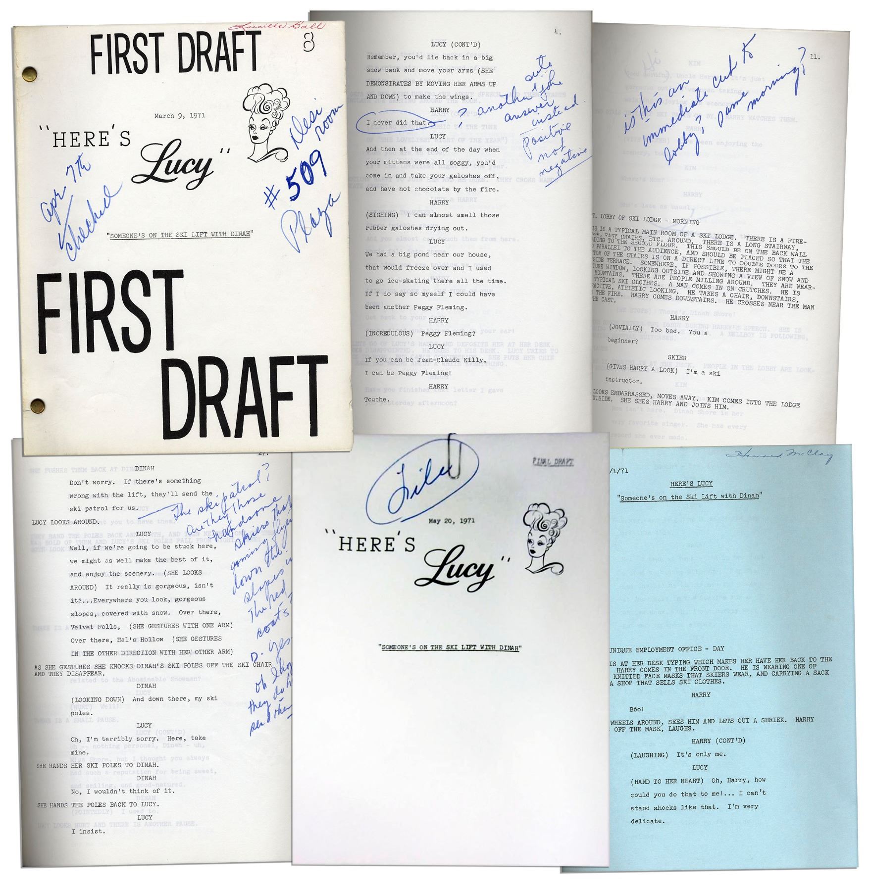 Take a peek into comedy legend Lucille Ball's creative process with these two unique scripts. Both are Mrs. Ball's personal copies for the episode entitled, ''Someone's On The Ski Lift With Dinah'' - guest starring Dinah Shore - from the 1971 season of ''Here's Lucy.'' You can track Mrs. Ball's script changes based on her handwritten notes between the first and final drafts of the script, which was written by Bob Carroll, Jr. and Madelyn Davis. Changes include toning down a Dinah Shore line that Lucy suggests might be ''...a little too much for Dinah's nice image...'' Her note was taken, as the line is removed in the final draft. Both scripts feature a cover that includes a fun cartoon caricature of Lucy. With a COA from Lucie Arnaz.
