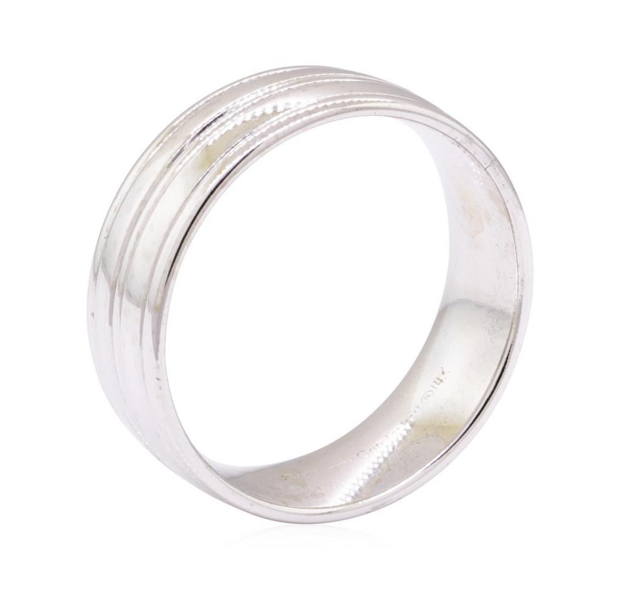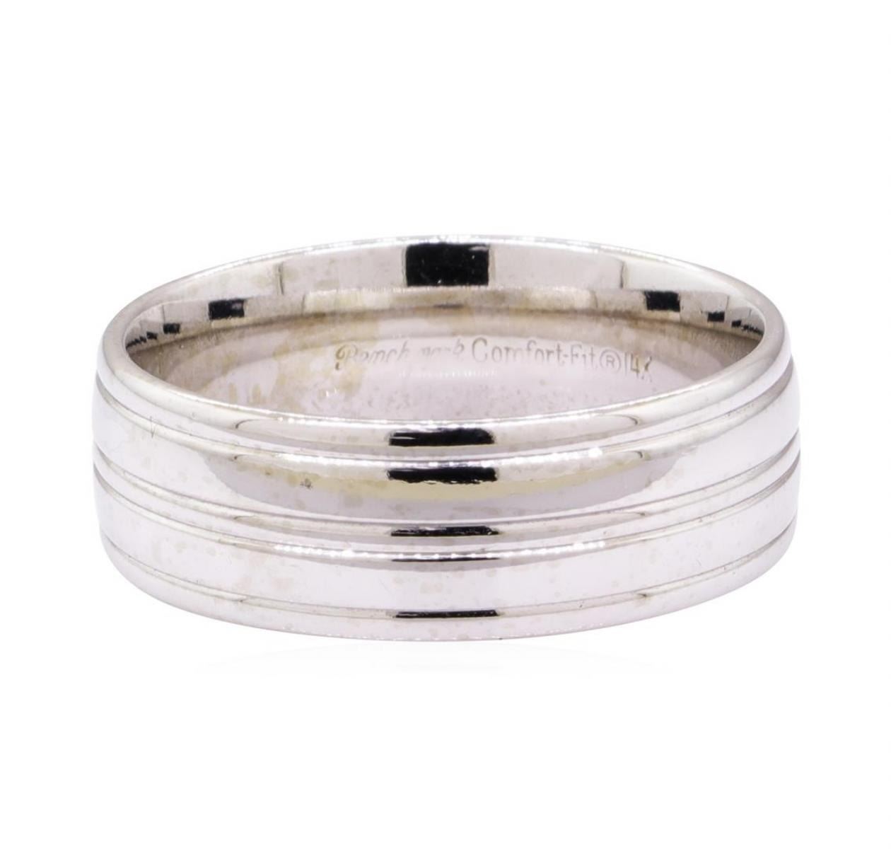 One man's comfort fit band featuring: 14KT white gold weighing 9.8 grams. The ring measures 7.8 millimeters wide.