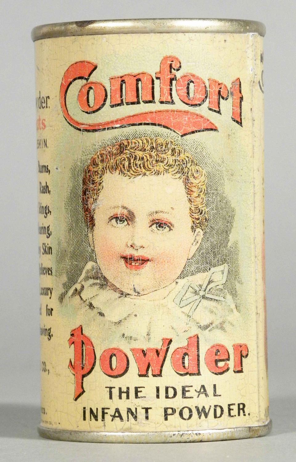 Comfort Powder Tin. The Ideal Infant Powder and Unequaled in Nursery and Sick Rooms. Baby and Nurse graphics on tin. Some very minor rubs otherwise excellent condition. 3 1/2 inches tall X 2 inch diameter. Starting bid $50