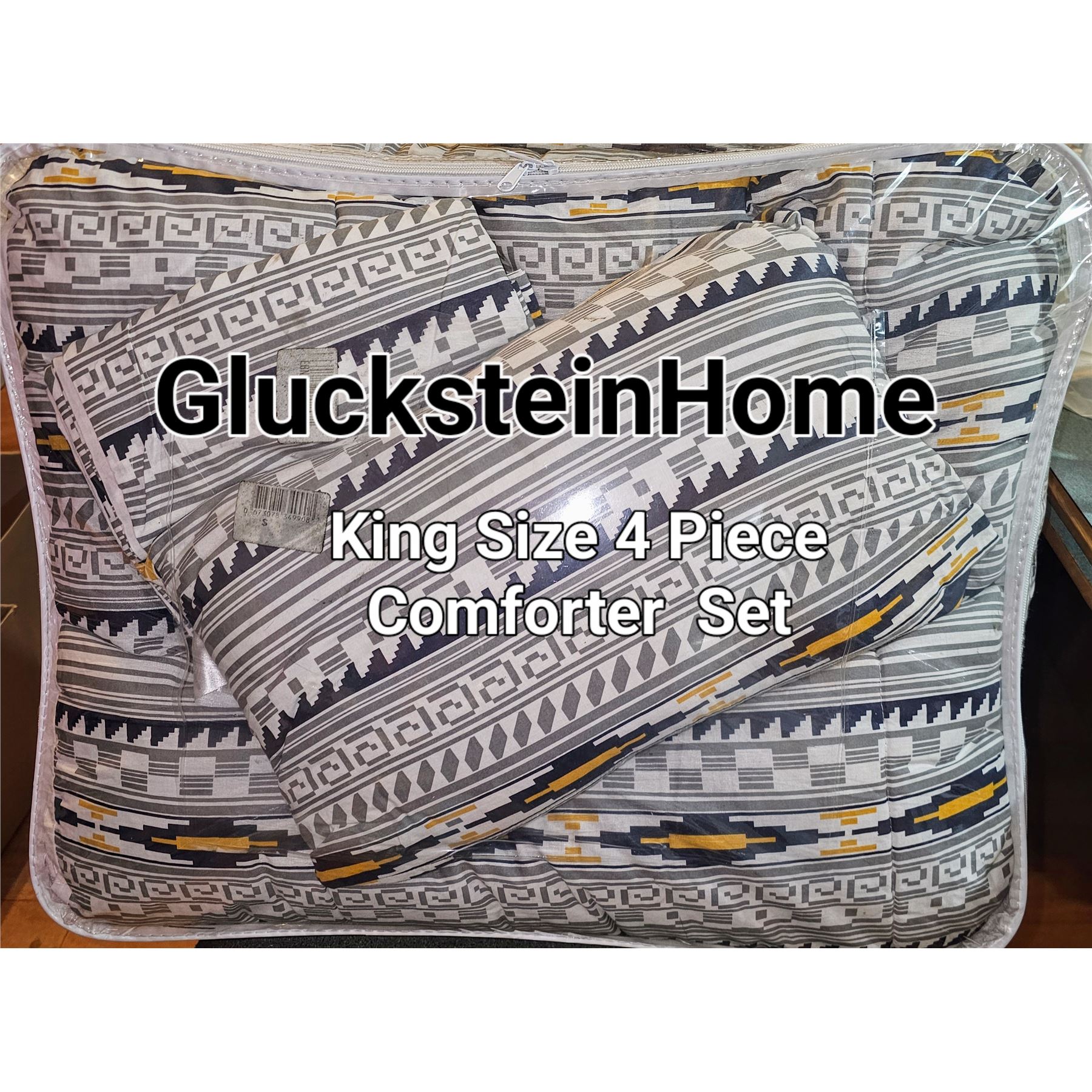 King size, four-piece set with geometric pattern, soft fabric, includes shams and decorative pillow, new.