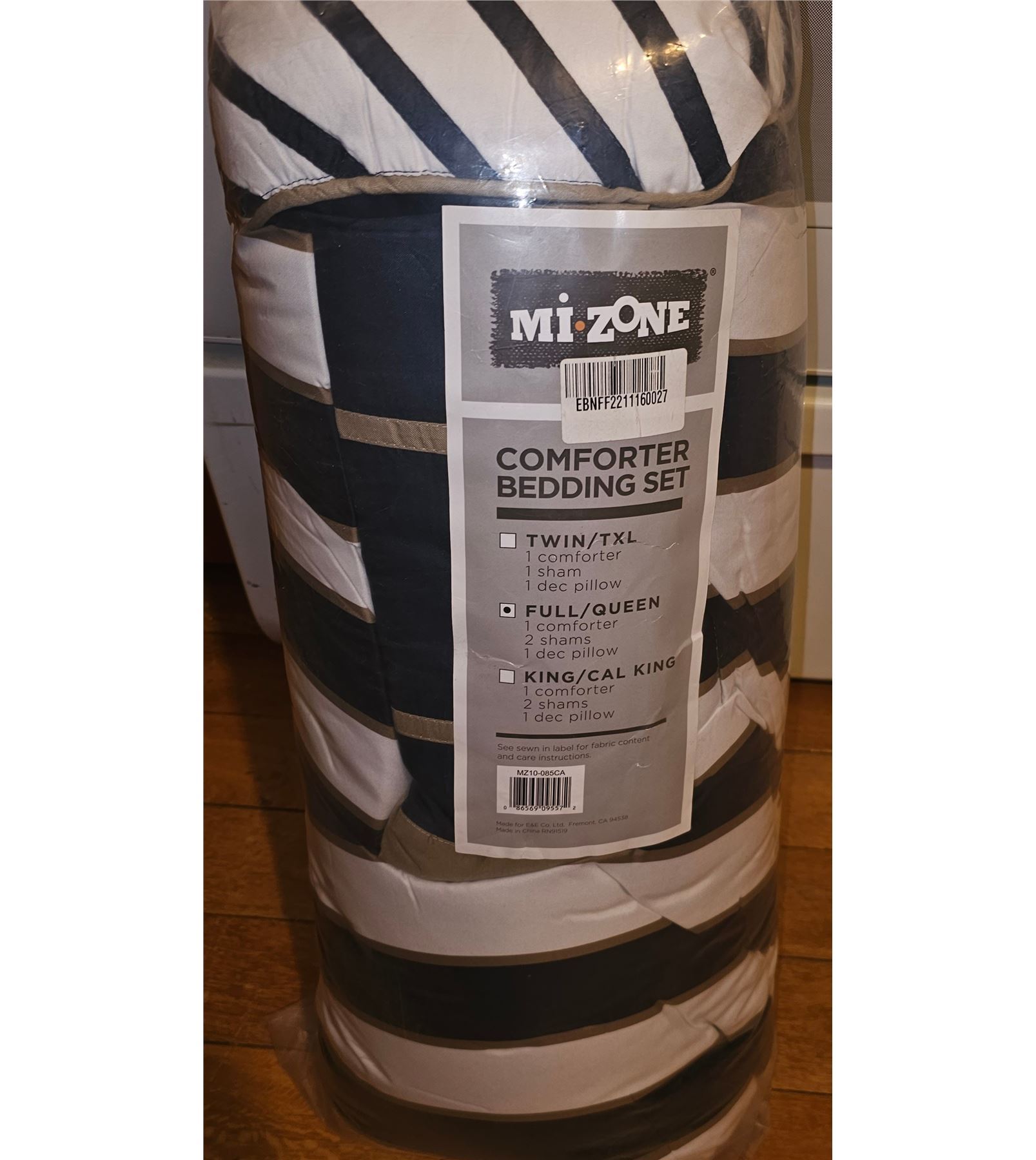 Stylish Full/Queen size bedding set with 1 comforter, 2 shams, and 1 decorative pillow, black and white stripe design, new.