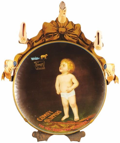 Rare Comfy Slippers Die Cut Tin Store Display. We have only seen 3 of these and this one is by far the best condition. Near Mint. Comes with 5 display shoes. 32 X 31 inches.