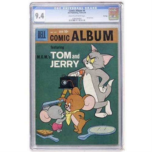 <B>Comic Album #4 Tom and Jerry - File Copy (Dell, 1958) CGC NM 9.4 Cream to off-white pages.</B></I> Tom and Jerry. Overstreet 2007 NM- 9.2 value = $55. CGC census 12/07: 2 in 9.4, none higher.<BR><BR><b>Shipping:</b> Comics - Slabbed (certified) (<a target="_blank" href="http://www.heritageauctions.com/common/shipping.php">view shipping information</a>)