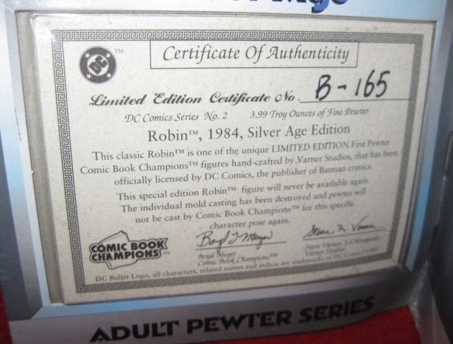 Collector Series, Robin, Fine Pewter Original, One Time Production, Artist Handcrafted, Comic Book Cover Replica, Silver Age. With COA.