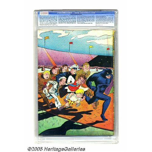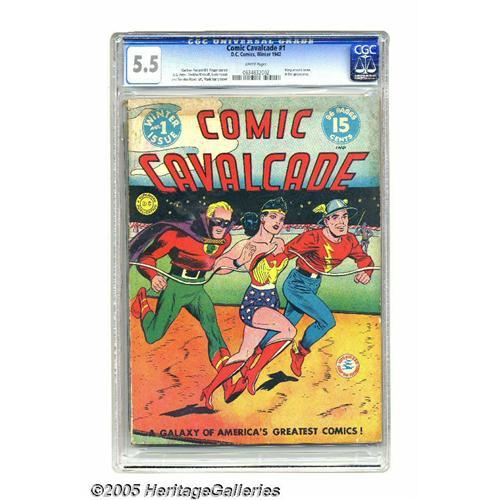 <B>Comic Cavalcade #1 (DC, 1942) CGC FN- 5.5 White pages.</B></I> After " "<B>World's Finest</B></I> proved a success, DC brought out this companion title, a whopping 96-pager headlined (as were all the early issues) by stars Green Lantern, Wonder Woman, and the Flash... and don't miss the other half of the wraparound cover, which shows the supporting cast, including Wildcat and the Ghost Patrol. The issue's artists include Sheldon Moldoff (drawing the Black Pirate), Sheldon Mayer (drawing the semiautobiographical ""Scribbly"" feature), E. E. Hibbard (drawing the Flash) and H. G. Peter (drawing Wonder Woman). Overstreet 2005 FN 6.0 value = $2,805. CGC census 8/05: 1 in 5.5, 7 higher. <BR><BR><B>Important notice:</B> Heritage usually auctions material at the rate of 200-250 lots per hour. On some occasions eBay Live bid software or the Internet may not be able to keep up with the pace of the auction. We recommend placing a realistic absentee bid now as insurance to avoid disappointment. Occasionally the auctioneer may eliminate or reject an eBay Live bid, and the auctioneer may also reopen a lot after the close of the eBay live bidding (usually because we missed an audience bid), and may reject your bid even if it shows you as the winning bidder. By bidding via eBay Live, you agree that Heritage may award the lot to another bidder at its sole discretion under the circumstances described above or any other reasonable circumstances. Since eBay bids are not shown to us until we open the lot on the floor, we treat those bids just like floor bids. In most cases the floor responds before the eBay bid is presented to us, due to Internet lag time, so for consistency we have made it a policy that floor bids are always considered first over tie eBay live bids. Also please note that all Heritage lots purchased through eBay Live carry a 20% Buyer's Premium. Please make sure you read the Terms and Conditions before you bid. This lot is being auctioned in conjunction with a live