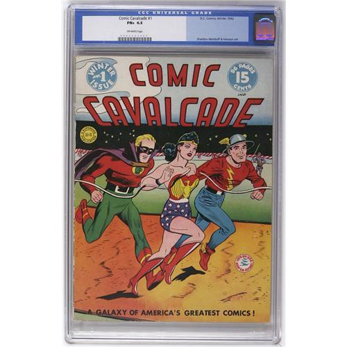 <B>Comic Cavalcade #1 (DC, 1942) CGC FN+ 6.5 Off-white pages.</B></I> Here's a well preserved copy with nice page quality. Half the fun of this issue is the wraparound cover, with Green Lantern, Wonder Woman, the Flash, Wildcat, the Ghost Patrol, Scribbly and more. In the interest of historical accuracy, the Black Pirate isn't running laps with the super-heroes, but he does appear in the issue, drawn by Sheldon Moldoff. Overstreet 2006 FN 6.0 value = $2,817; VF 8.0 value = $6,573. CGC census 3/06: 3 in 6.5, 4 higher.