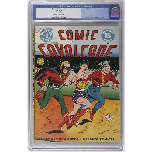 <B>Comic Cavalcade #1 (DC, 1942) CGC VF- 7.5 Off-white to white pages.</B></I> Lots of characters packed into this 96-pager, including the Flash, Green Lantern, Wonder Woman, Wildcat, and the Black Pirate. Sheldon Moldoff art is featured. This issue is notoriously tough in high grade, owing to the troublesome cardboard covers, and our copy is bested by just one other in CGC's current census. Overstreet 2006 VF 8.0 value = $6,573. CGC census 03/06: 1 in 7.5, 2 higher.