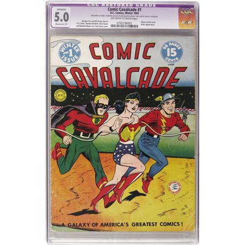 <B>Comic Cavalcade #1 (DC, 1942) CGC Apparent VG/FN 5.0 Moderate (P) Off-white to white pages.</B></I> The wraparound cover's the best part of this fun 96-pager. Green Lantern, Wonder Woman, and the Flash are the headliners. CGC notes, "Restoration includes: moderate amount of color touch to interior, tear seals to interior, reinforced." Overstreet 2006 GD 2.0 value = $939; VG 4.0 value = $1,878; FN 6.0 value = $2,817. <I> From the Janowicz Collection.</B></I><BR><BR><b>Shipping:</b> Comics - Slabbed (certified) (<a target="_blank" href="http://www.heritageauctions.com/common/shipping.php">view shipping information</a>)