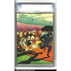 Comic Cavalcade #1 (DC, 1942). DC was actually two companies working in tandem, one run by M.C. Gaines (All-American), and the other by Harry Donenfeld (DC). Green Lantern, Wonder Woman and the Flash were products of All-American, and in similar fashion to World's Finest, were given their own "team" book, Comic Cavalcade. This issue is squarebound, exhibiting normal wear with no outstanding defects, making it a perfect copy for the cost-conscious collector. CGC notes, "1" to 2" bindery tears on every page". CGC VG- 3.5 Off-white to white pages. Overstreet 2001 GD 2.0 value = $825; FN 6.0 value = $2,475. Important notice: We expect to be auctioning lots at the rate of 200-250 per hour. Sometimes eBay Premier live bid software cannot keep up with that pace, so we strongly recommend that you place a realistic proxy bid now as insurance to avoid disappointment. Also please note that all Heritage/CAA lots purchased through eBay Premier carry a 20% Buyer's Premium.