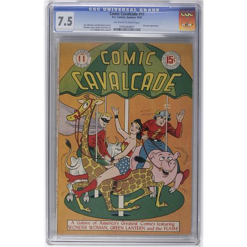 <B>Comic Cavalcade #11 (DC, 1945) CGC VF- 7.5 Off-white to white pages.</B></I> Even mighty heroes like Green Lantern, the Flash, and Wonder Woman need a little "down time," so a playful hop on a merry-go-round is in order on this unusual E. E. Hibbard cover. Inside, there's an appearance by Wonder Woman's feline foe, Cheetah. This square bound comic is quite pleasing to the eye, well-centered and colorful. Overstreet 2006 VF 8.0 value = $650. CGC census 3/06: 1 in 7.5, 2 higher.