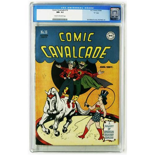 <B>Comic Cavalcade #16 "D" Copy pedigree (DC, 1946) CGC NM- 9.2 Cream to off-white pages.</B></I> This very attractive square bound comic stars the All-American "big guns," Wonder Woman, the Flash, and Green Lantern. E. E. Hibbard provided the circus-themed cover, while Martin Naydel and Paul Reinman handled art chores inside. Overstreet 2005 NM- 9.2 value = $1,200. CGC census 11/05: 1 in 9.2, 1 higher.
