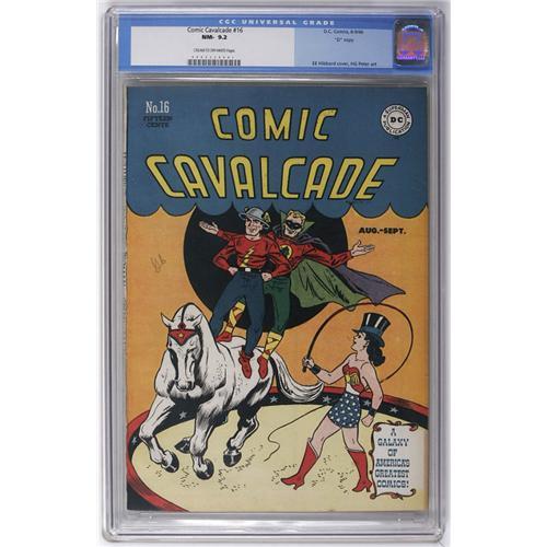 <B>Comic Cavalcade #16 "D" Copy pedigree (DC, 1946) CGC NM- 9.2 Cream to off-white pages.</B></I> This very attractive square bound comic stars the All-American "big guns," Wonder Woman, the Flash, and Green Lantern. E. E. Hibbard provided the circus-themed cover, while Martin Naydel and Paul Reinman handled art chores inside. Overstreet 2006 NM- 9.2 value = $1,240. CGC census 03/06: 2 in 9.2, 2 higher.