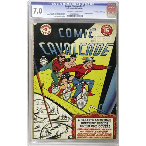 <B>Comic Cavalcade #2 Davis Crippen ("D" Copy) pedigree (DC, 1943) CGC FN/VF 7.0 Off-white to white pages.</B></I> The Flash, Wonder Woman, and Green Lantern take time off from their normal 9 to 5, save-the-world jobs to earn some extra money performing under the big top on this cover from artist Frank Harry. Nazis infiltrate this issue, appearing in five of the ish's stories, one of which even has an appearance by <I>der Fuehrer</B></I>. Harry and Sheldon Moldoff add to the interior. Overstreet 2006 FN 6.0 value = $777; VF 8.0 value = $1,619. CGC census 10/06: 3 in 7.0, 2 higher. <I>From the Crippen Collection</B></I>.<BR><BR><b>Shipping:</b> Slabbed Comic (<a target="_blank" href="http://www.heritageauctions.com/common/shipping.php">view shipping information</a>)