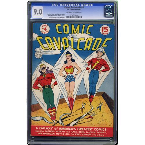 <B>Comic Cavalcade #4 (DC, 1943) CGC VF/NM 9.0 Off-white to white pages.</B></I> This copy from Harold Curtis' original-owner collection takes over the top spot in CGC's census -- in fact, it's the only copy certified above 7.5 as of this writing. As crease-prone as the stiff covers of these square bound books could be, it's nice to see that one has survived in this condition. Wonder Woman, Green Lantern, and the Flash (seen on the cover by Frank Harry) are joined by a host of backup features, including an outing for Sheldon Mayer's Scribbly that guest-stars that wacky superheroine the Red Tornado. Overstreet 2006 VF/NM 9.0 value = $1,572; NM- 9.2 value = $2,150. CGC census 1/06: 1 in 9.0, none higher. <I>From the Collection of Harold Curtis.</B></I>