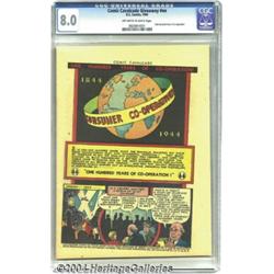 <B>Comic Cavalcade Giveaway #nn "One Hundred Years Of Co-Operation" (DC, 1944) CGC VF 8.0 Off-white to white pages.</B></I> Here's an unusual item that will pique the curiosity of every Golden Age collector. This eight-page promotional comic reprints the "picture story" from <B>Comic Cavalcade</B></I> #9. A notice at the bottom of the last page informs distributors of the availability of additional copies at cost of $1.00 per hundred. And before you get any ideas: that offer's no longer valid. Overstreet 2004 VF 8.0 value = $425. <BR><BR><B>Important notice:</B> Heritage usually auctions material at the rate of 200-250 lots per hour. On some occasions eBay Live bid software or the Internet may not be able to keep up with the pace of the auction. We recommend placing a realistic absentee bid now as insurance to avoid disappointment. Occasionally the auctioneer may eliminate or reject an eBay Live bid, and the auctioneer may also reopen a lot after the close of the eBay live bidding (usually because we missed an audience bid), and may reject your bid even if it shows you as the winning bidder. By bidding via eBay Live, you agree that Heritage may award the lot to another bidder at its sole discretion under the circumstances described above or any other reasonable circumstances. Since eBay bids are not shown to us until we open the lot on the floor, we treat those bids just like floor bids. In most cases the floor responds before the eBay bid is presented to us, due to Internet lag time, so for consistency we have made it a policy that floor bids are always considered first over tie eBay live bids. Also please note that all Heritage lots purchased through eBay Live carry a 20% Buyer's Premium. Please make sure you read the Terms and Conditions before you bid. </span></font></tr></table></td></tr></table>