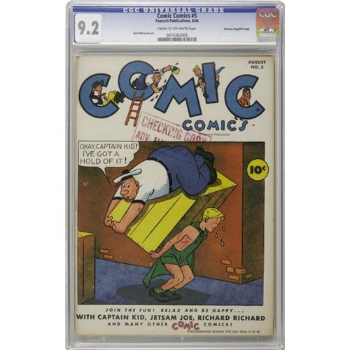 <B>Comic Comics #5 Crowley Copy/File Copy (Fawcett, 1946) CGC NM- 9.2 Cream to off-white pages.</B></I> Featuring youthful hero Captain Kid. Basil Wolverton art. Has a "Checking Copy" stamp on the front cover. Overstreet 2006 NM- 9.2 value = $160. CGC census 10/06: 1 in 9.2, 1 higher.<BR><BR><b>Shipping:</b> Slabbed Comic (<a target="_blank" href="http://www.heritageauctions.com/common/shipping.php">view shipping information</a>)