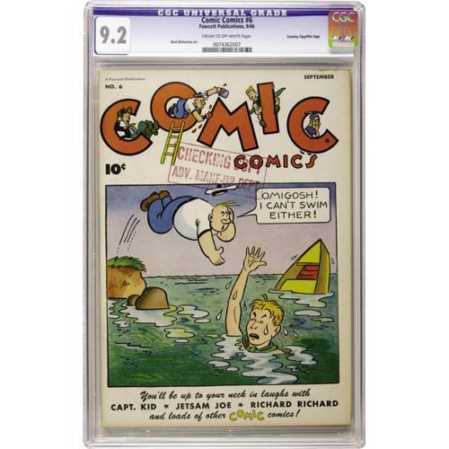 <B>Comic Comics #6 Crowley Copy/File Copy (Fawcett, 1946) CGC NM- 9.2 Cream to off-white pages.</B></I> More adventures of Captain Kid, plus art by Basil Wolverton. Has "Checking Copy" stamp on front cover. Overstreet 2006 NM- 9.2 value = $160. CGC census 10/06: 1 in 9.2, 1 higher.<BR><BR><b>Shipping:</b> Slabbed Comic (<a target="_blank" href="http://www.heritageauctions.com/common/shipping.php">view shipping information</a>)