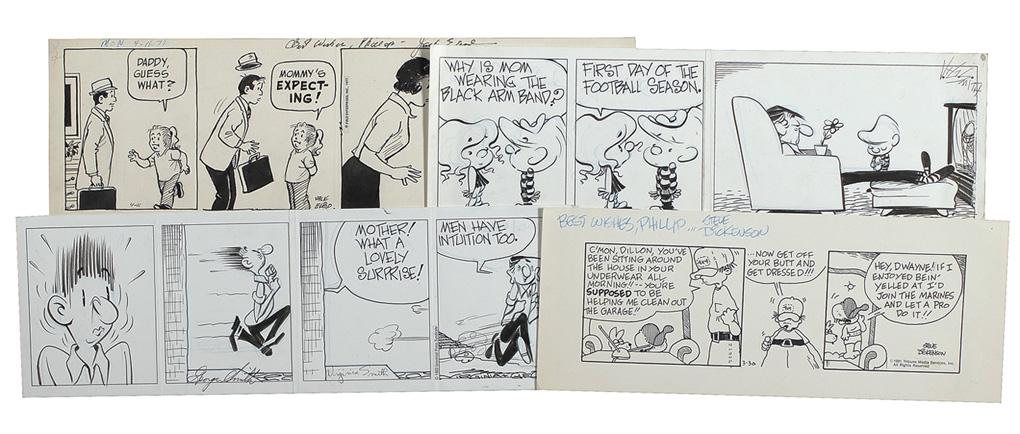Four hand-inked daily comic strips including: one three-panel Jack Elrod from 1977 on a 17 x 5.5 sheet of artist’s cardstock, signed and inscribed “Best wishes, Phillip - Jack Elrod”; one three-panel Steve Dickenson from 1991 on a 14 x 5.5 sheet of artist’s cardstock, signed and inscribed “Best wishes, Phillip - Steve Dickenson,” and two George and Virginia Smith comic strips each on a 16.5 x 5.5 sheet of artist’s cardstock, signed by both. In fine condition, with light edge toning and previous folds.