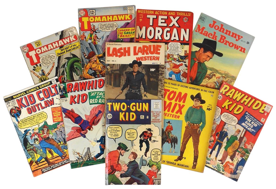 Comic books (10), Tex Morgan, Comic Combine, Vol 1, #5, '49; Kid Colt Outlaw, Marvel, Vol 1, #191, '75; Two-Gun Kid, Non-Pareil Publ, Vol 1, #62, '63; Tom Mix, Fawcett, Vol 6, #32, '50 (pen marking & edge wear on frt cover); Lash LaRue, Fawcett, Vol 1, #6, '50; Johnny Mack Brown, Dell, #6, '51 (pencil mark frt cover); Tomahawk, Natl Comics, #73, '61 (cover crease); Tomahawk, Natl Periodical, #78, '62; Rawhide Kid, Atlas, Vol 1, #30, '62 & Rawhide Kid, Atlas, Vol 1, #38, '64; G/VG cond unless noted.