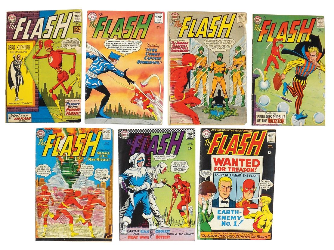 Comic books (7), The Flash, Natl Comics #117, '60 & Natl Periodical issues #133, '62 (sm tear on rt frt cover); #136, '63 (sm tears & curled pgs); #142, '64; #144, '64; #156, '65; #166, '66; Good/Exc cond.