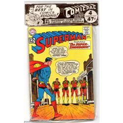 Comicpac B3 (DC, 1962) Condition: Average VF+. This is an unopened pack of four DC comics from May and June of 1962. It includes Superman #153, Many Loves of Dobie Gillis #13, Justice League of America #11, and Sea Devils #5. With the exception of a small tear at the bottom of the Dobie Gillis comic, these books appear to be in excellent condition. Overstreet 2003 VF 8.0 value for group = $389. Important notice: Heritage usually auctions material at the rate of 200-250 lots per hour. On some occasions eBay Live bid software or the Internet may not be able to keep up with the pace of the auction. We recommend placing a realistic absentee bid now as insurance to avoid disappointment. Occasionally the auctioneer may eliminate or reject an eBay Live bid, and the auctioneer may also reopen a lot after the close of the eBay live bidding (usually because we missed an audience bid), and may reject your bid even if it shows you as the winning bidder. By bidding via eBay Live, you agree that Heritage may award the lot to another bidder at its sole discretion under the circumstances described above or any other reasonable circumstances. Also please note that all Heritage lots purchased through eBay Live carry a 20% Buyer's Premium. Please make sure you read the Terms and Conditions before you bid.