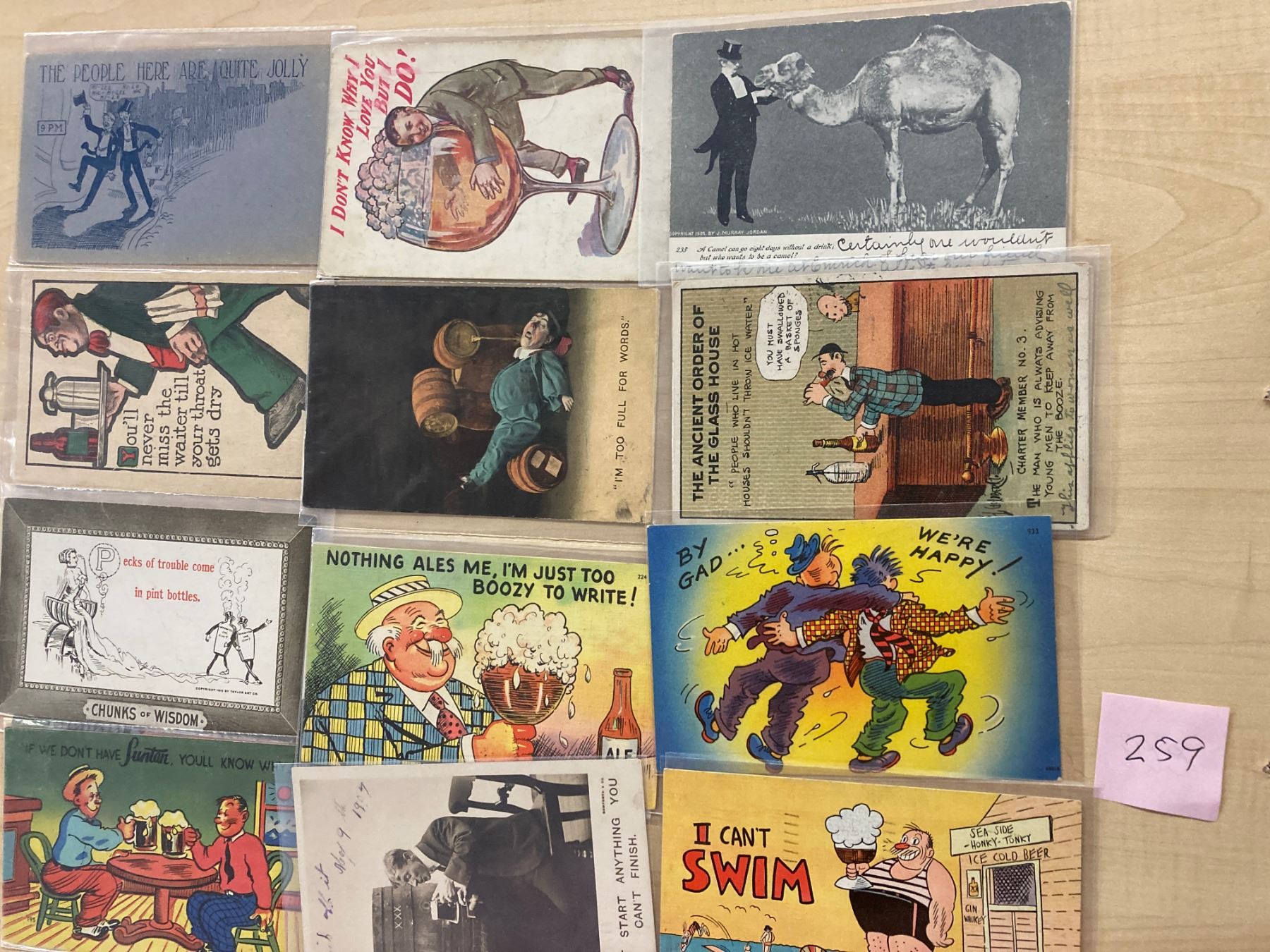 Over 200 cards. Drinking, hobos, outhouses, animals, etc. Early to linen.